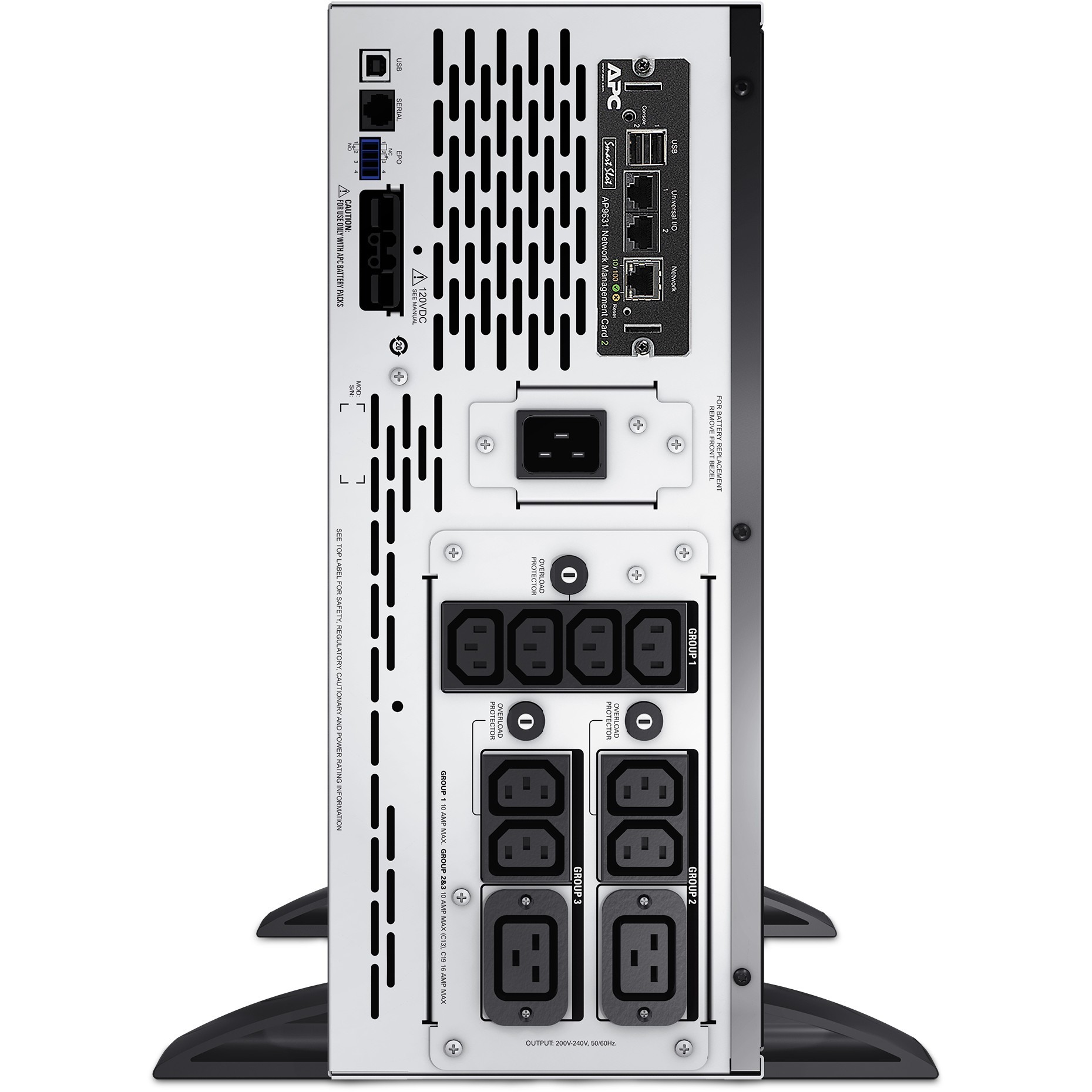 APC Smart-UPS X SMX3000HVNC - 3000VA. 8x C13 + 2x C19 outlet. USB. expandable runtime. short depth. NMC. UPS topology: Line-Interactive. Output power capacity: 3 kVA. Output power: 2700 W. AC outlet types: C13 coupler. C19 coupler. Power plug: C20 coupler. AC outlets quantity: 10 AC outlet(s). Battery technology: Sealed Lead Acid (VRLA). Battery capacity: 738 VAh. Typical backup time at full load: 6.25 min. Form factor: Rackmount/Tower. Product colour: Black. Rack capacity: 4U. Compliance certificates: RoHS. Certification: C-tick. CE. CSA. EN 50091-1. EN 50091-2. EN 55022 Class A. EN 60950. FCC Part 15 Class A. GOST....