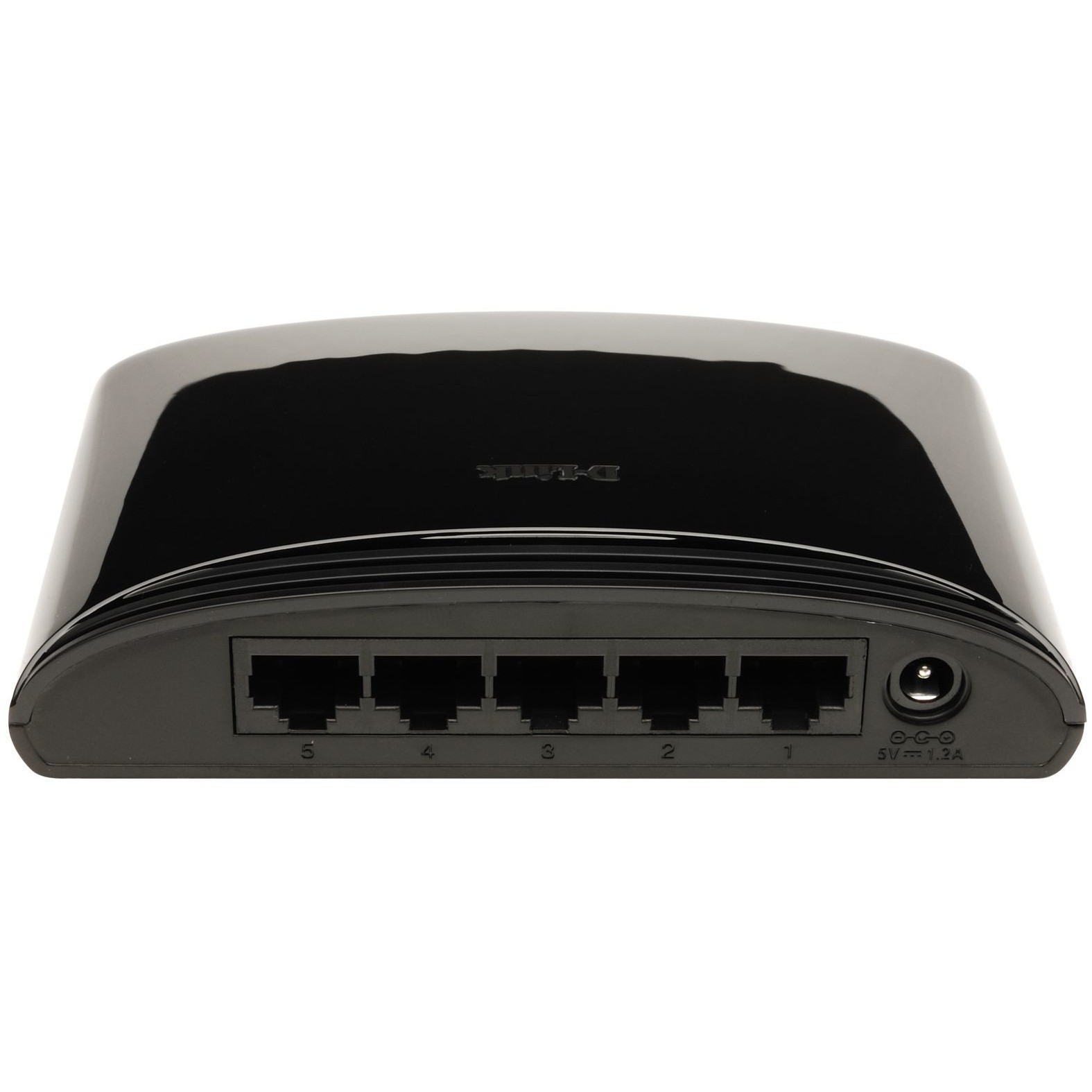 D-Link DES-1005D 5-port unmanaged Fast Ethernet switch (10/100 Mbps), full-duplex, 2000 MAC entries, 1 Gbit/s switching capacity, low power (~2.5W), plug-and-play.