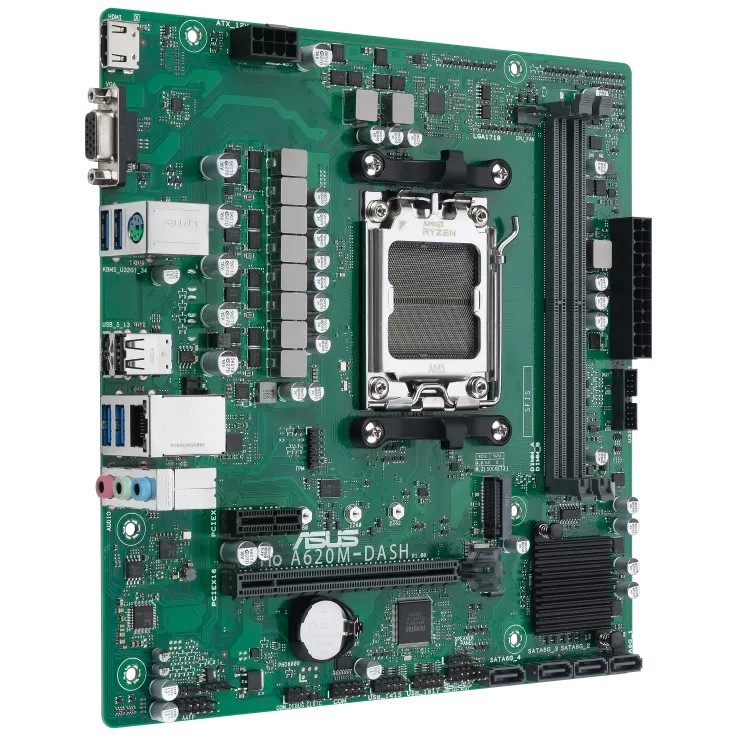ASUS PRO A620M-DASH-CSM micro-ATX motherboard: Socket AM5, AMD A620 chipset, DDR5 dual-channel up to 96GB (max 7200MHz), 1x M.2, 4x SATA III, HDMI, VGA, Gigabit LAN.