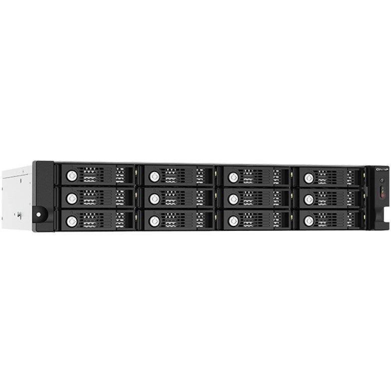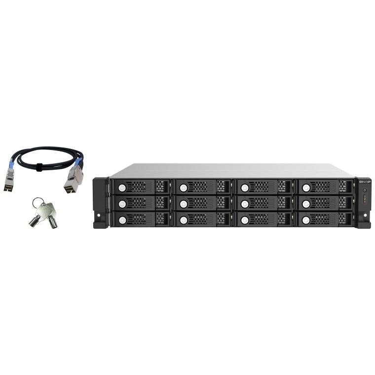 QNAP TL-R1220SEP-RP 12-bay 2U JBOD enclosure for 2.5/3.5 inch SAS-3 & SATA III drives, 12Gbps Mini-SAS HD, hot-swap, dual fans, 100-240V AC, black/grey.