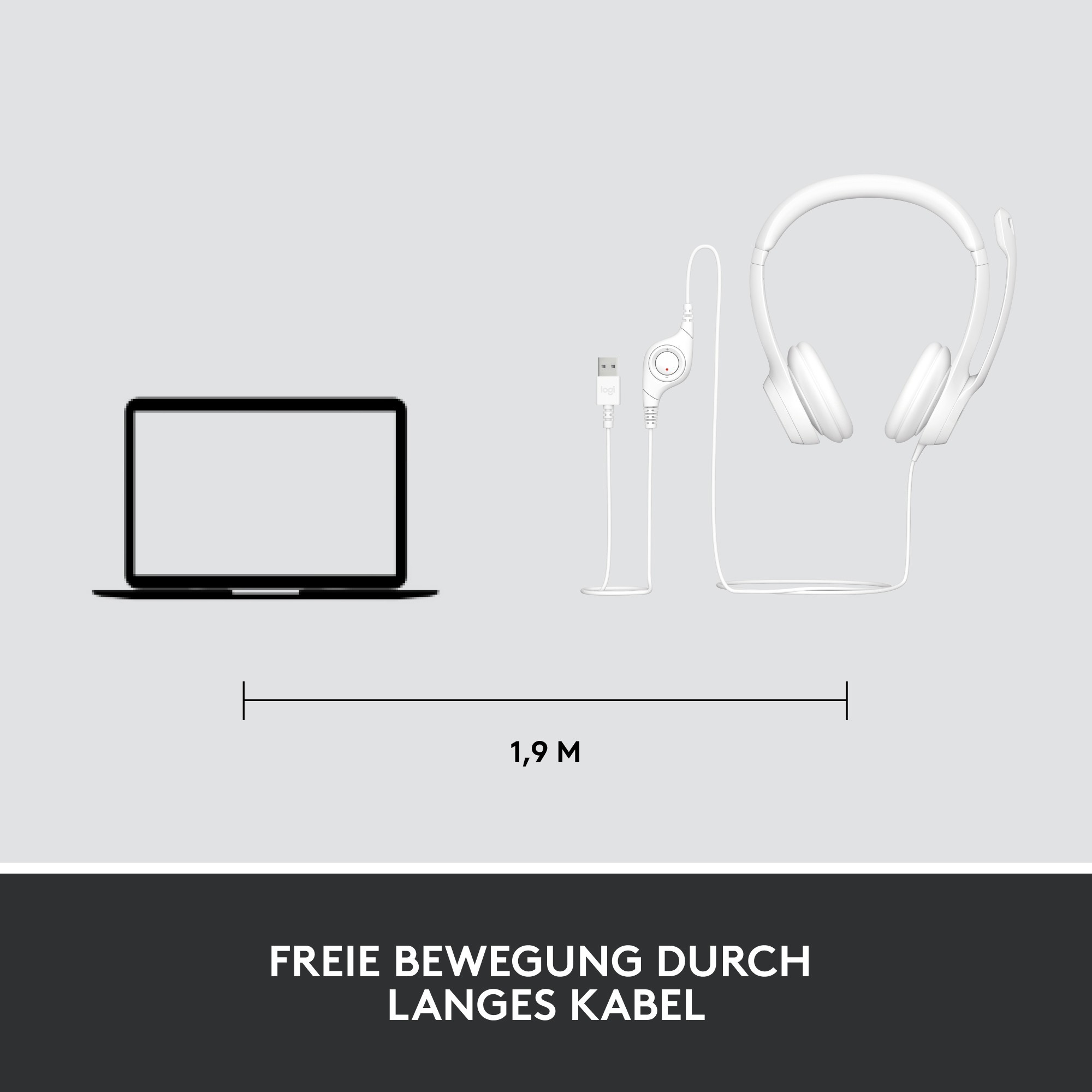 Logitech H390 USB Headset - Wired USB-A On‑Ear Headset - White, Boom Microphone, Inline Controls, 1.9m Cable