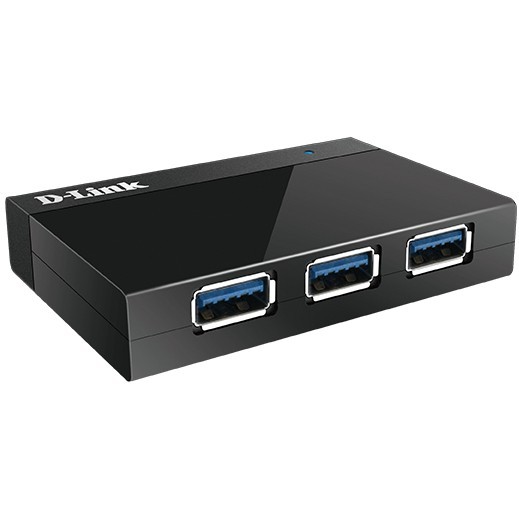 D-Link DUB-1340 4-port USB 3.0 SuperSpeed hub with external power adapter (5V/4A). Compact black design, backward-compatible with USB 2.0/1.1. Windows and Mac compatible.