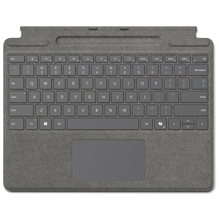 Alcantara Platinum Type Cover for Surface Pro 10/9/8/X (Business). German QWERTZ, Copilot key, integrated pen storage, touchpad, connects via Microsoft Cover port.