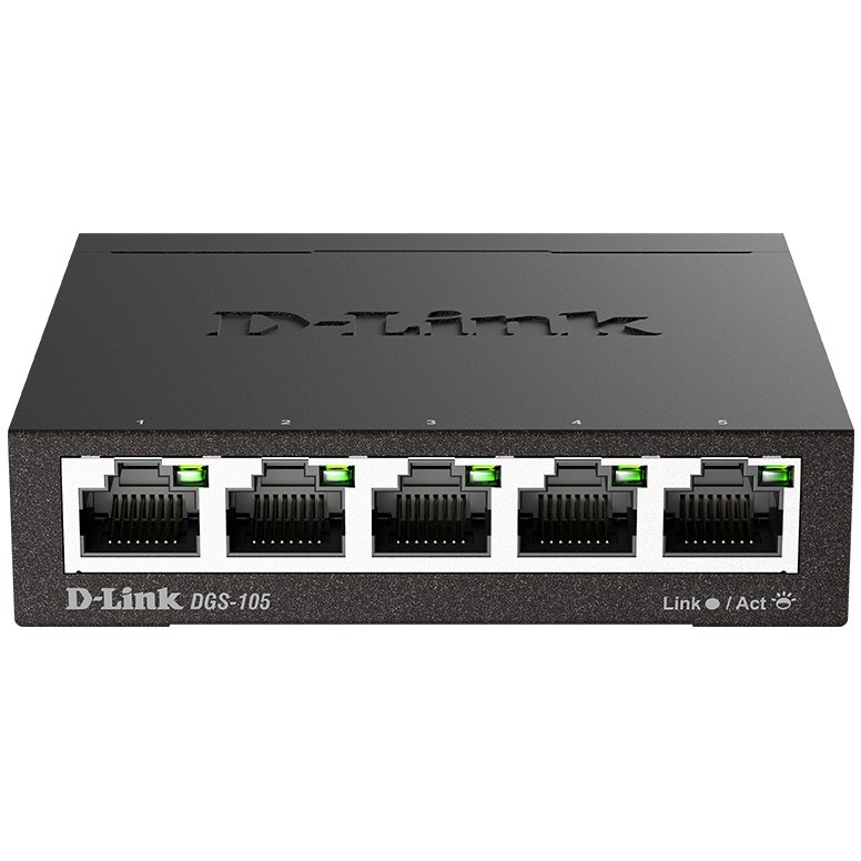 D-Link DGS-105. Switch type: Unmanaged. Switch layer: L2. Basic switching RJ-45 Ethernet ports type: Gigabit Ethernet (10/100/1000). Basic switching RJ-45 Ethernet ports quantity: 5. Full duplex. MAC address table: 2000 entries. Switching capacity: 10 Gbit/s. Networking standards: IEEE 802.1p. IEEE 802.3. IEEE 802.3ab. IEEE 802.3az. IEEE 802.3u. IEEE 802.3x. Power connector: DC-in jack