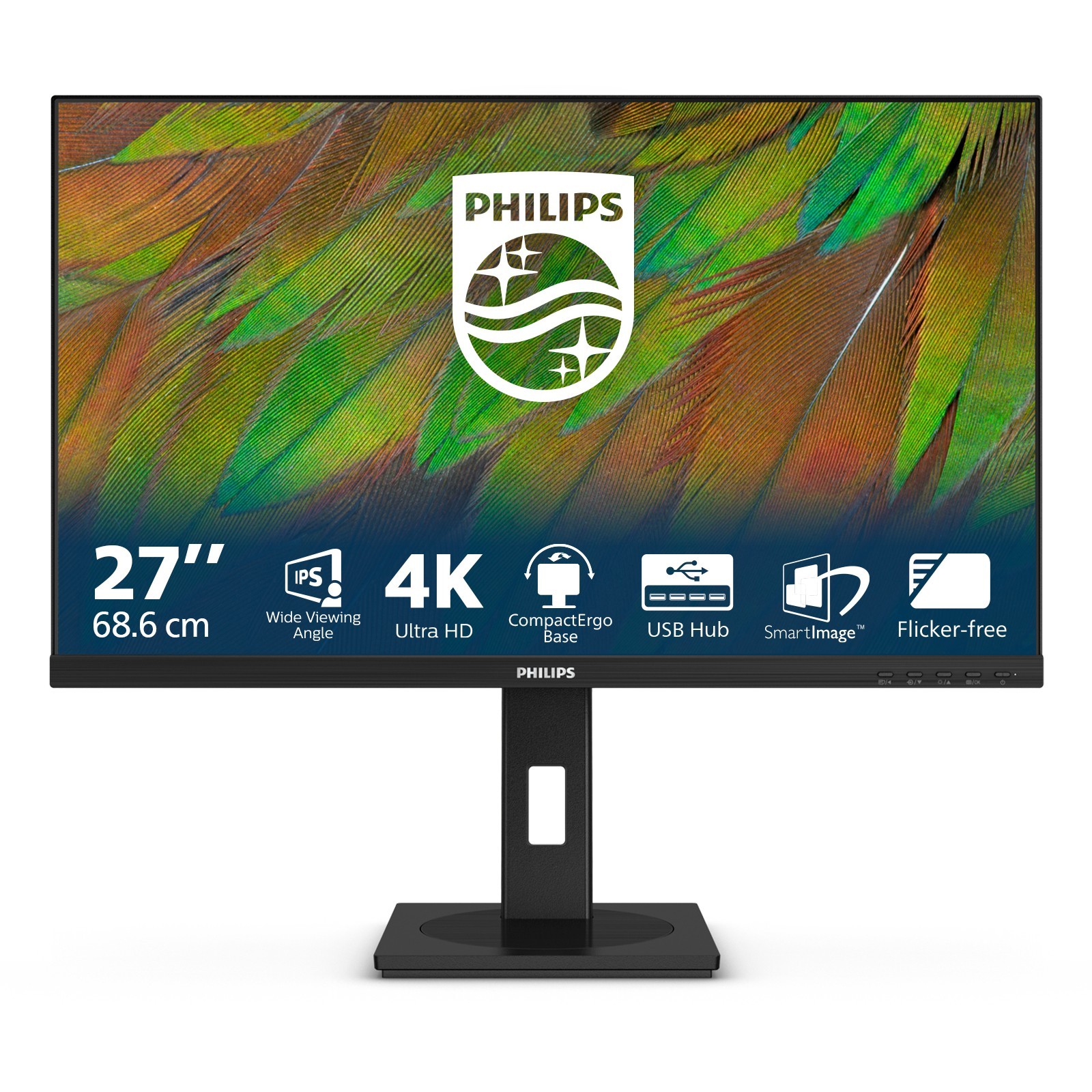 Philips 27B1N3800 27" 4K IPS monitor with 60 Hz, 2x HDMI, DisplayPort, USB hub, built-in speakers, and adjustable pivot stand. Black.