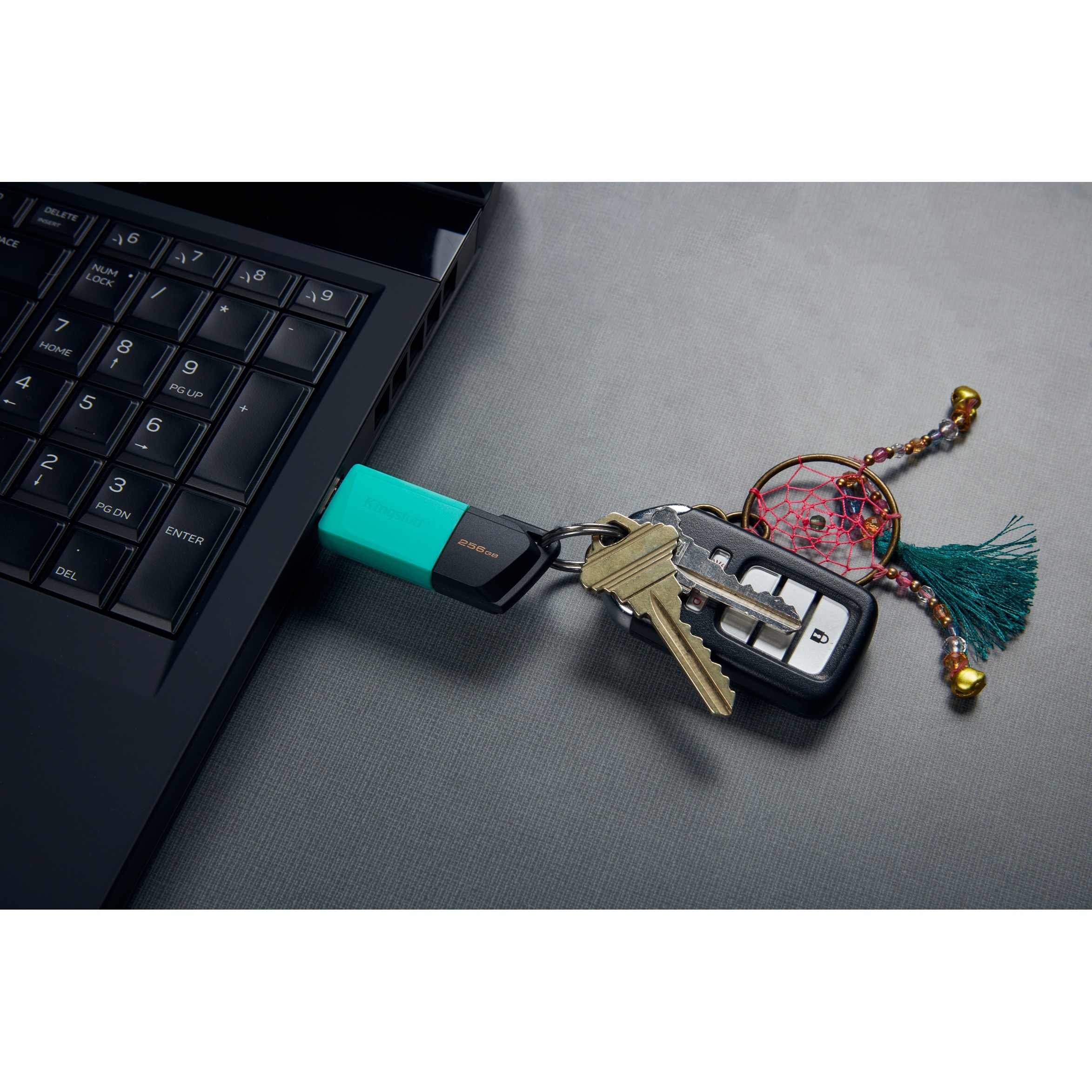 Kingston DataTraveler Exodia 256GB USB 3.2 Gen1 (USB-A) flash drive — slide design with keyring, black/teal. Compatible with Windows, macOS, Linux, Chrome OS. Lightweight portable.