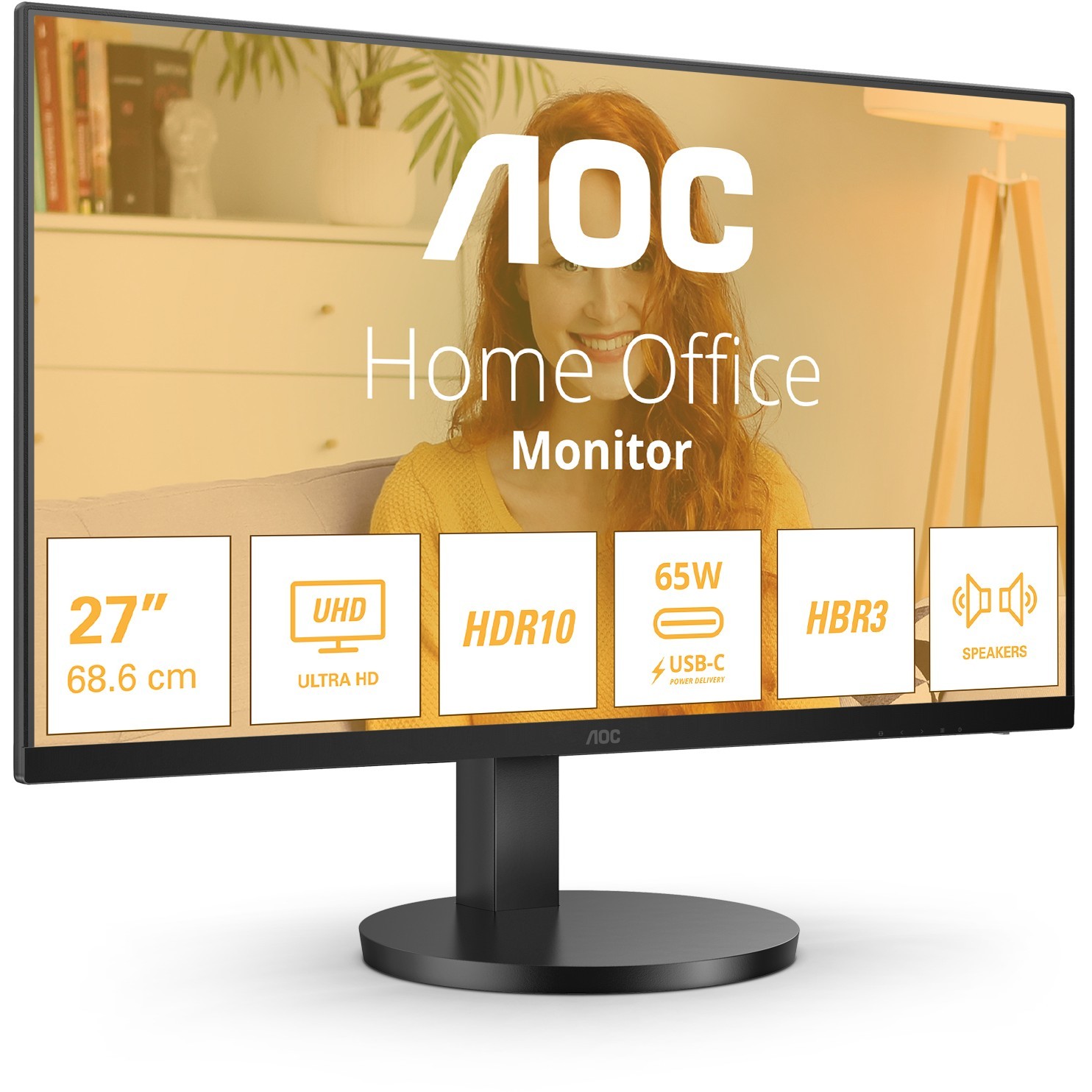 AOC U27B3CF 27-inch 4K (3840×2160) IPS monitor — 60Hz, 4 ms, USB-C PD 65W, 2×HDMI 2.0, HDR10, 2×2W speakers, 100×100 VESA, height adjustable, black