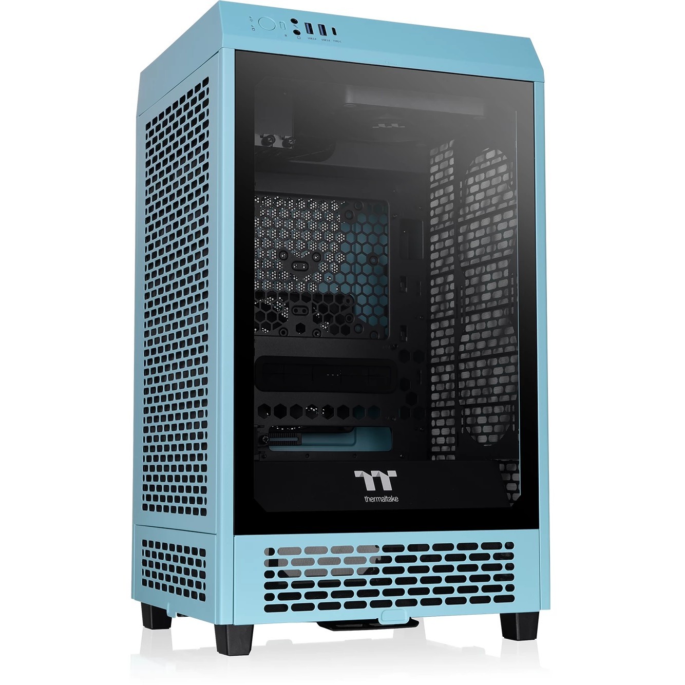 Thermaltake Tower 200 TG mini-ITX gaming case in turquoise. Supports up to 380mm GPU, 200mm CPU cooler, 2x3.5in + 4x2.5in drives, USB-C + 2xUSB-A, 2x140mm fans included.