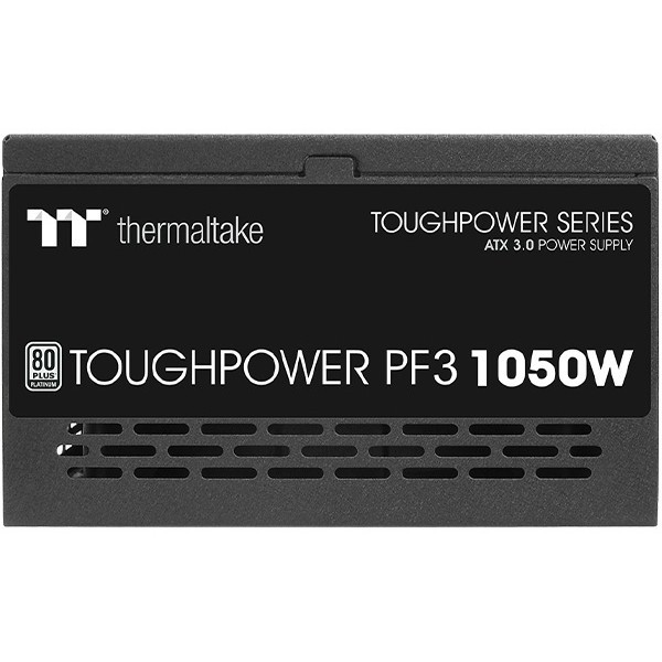 Thermaltake Toughpower PF3. Total power: 1050 W. AC input voltage: 100 - 240 V. AC input frequency: 50/60 Hz. Motherboard power connector: 24-pin ATX. Motherboard power cable length: 60 cm. SATA power cable length: 150.500 mm. Purpose: PC. Power supply unit (PSU) form factor: ATX. 80 PLUS certification: 80 PLUS Platinum. Product colour: Black. Cooling type: Active. Fan diameter: 12 cm. Cables included: PCIe. Peripheral (Molex). SATA