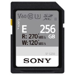 Sony SF-E256. Capacity: 256 GB. Flash card type: SDXC. Flash memory class: Class 10. Internal memory type: UHS-II. Read speed: 270 MB/s. Write speed: 120 MB/s. UHS Speed Class: Class 3 (U3). Video Speed Class: V60. Protection features: Shock resistant. Waterproof. Product colour: Black