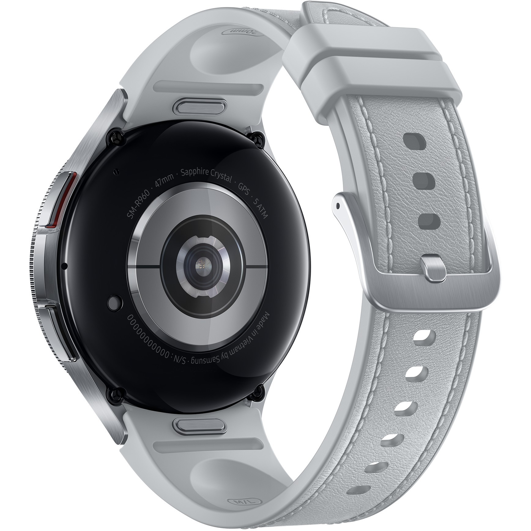 Samsung Galaxy Watch 6 R960 Classic with Wi-Fi: 47mm silver case; Wear OS, GPS, heart-rate sensor, and 5 ATM water resistance.