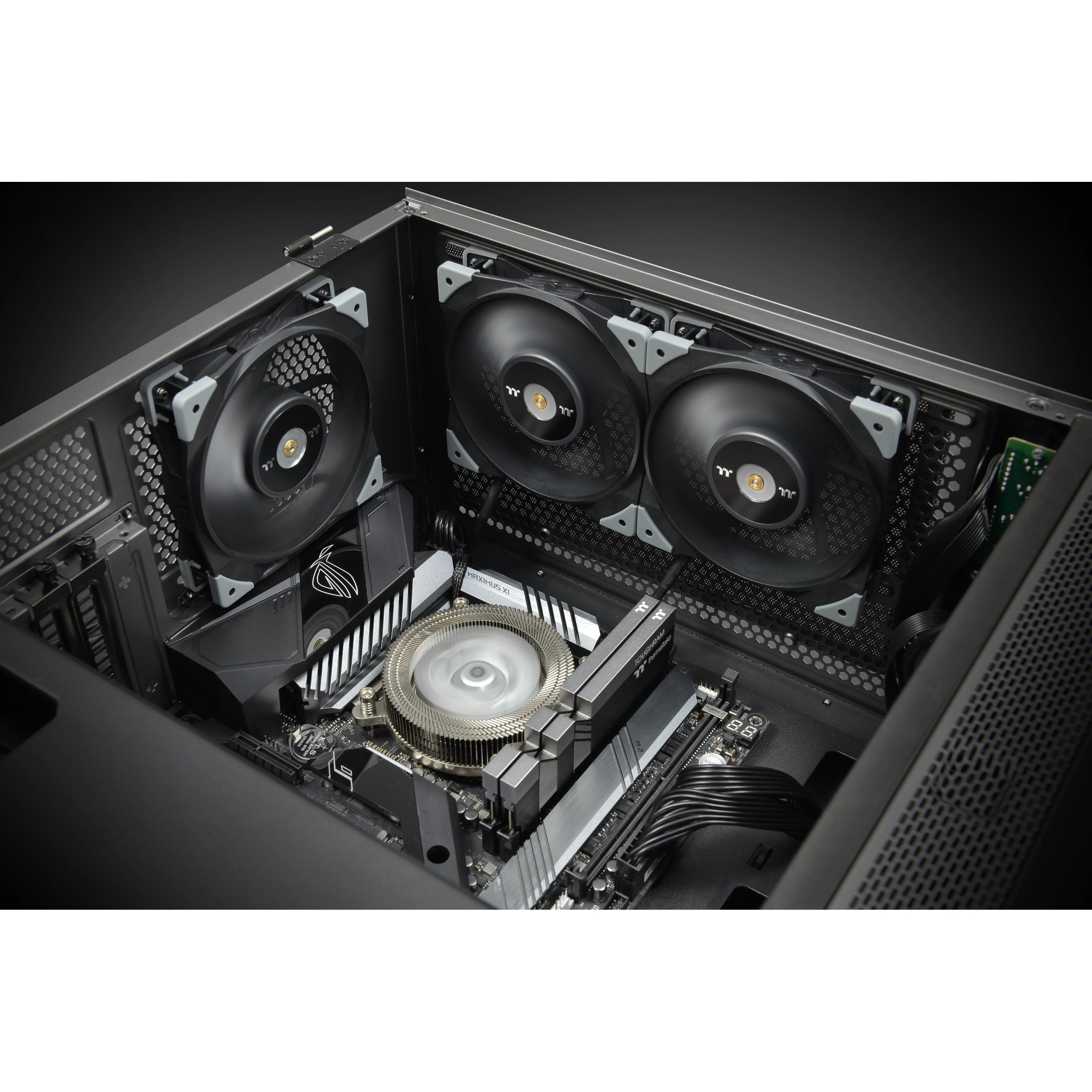 Dual-pack 120mm Thermaltake ToughFan 12 PWM fans with 4-pin PWM, 500-2000 RPM, 25mm thick for case airflow.