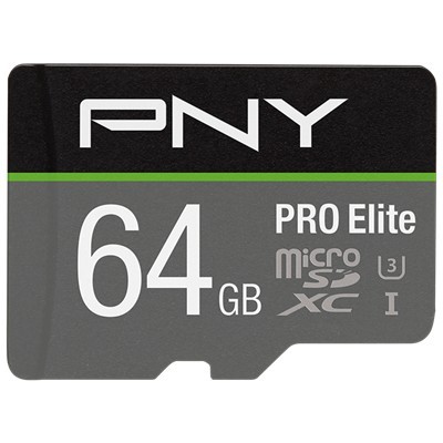 PNY PRO Elite MicroXC microSD card, 64GB, up to 100 MB/s transfer, includes adapter.