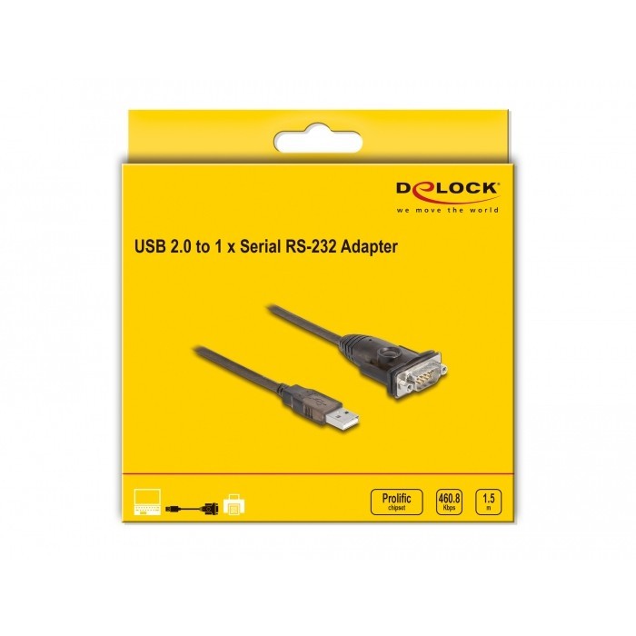 Delock USB 2.0 Type-A to RS-232 DB9 serial adapter; USB to RS-232 converter for legacy devices; compact plug-and-play design.