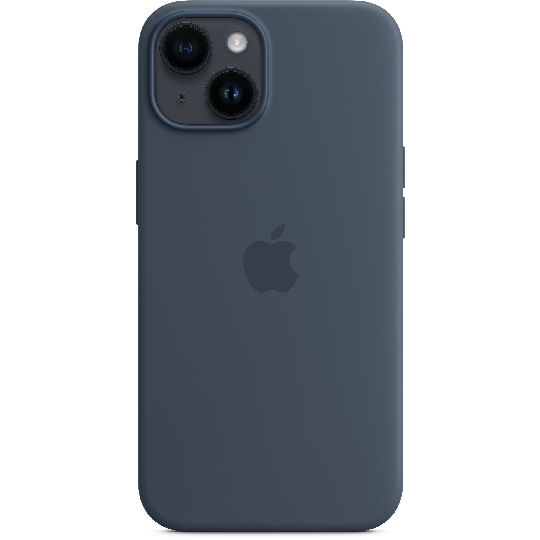 Silicone case for iPhone 14 with MagSafe; Storm Blue; wireless charging compatible; basic protection.