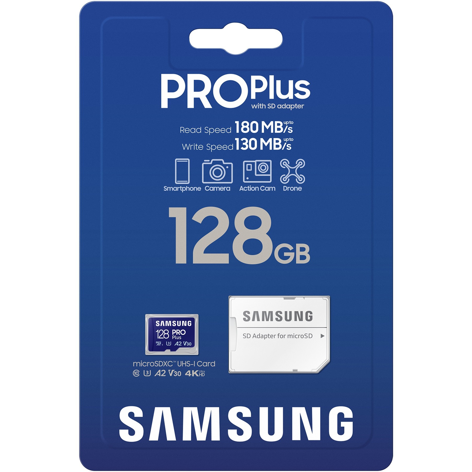 128GB Samsung PRO Plus microSD card with UHS-I and U3 for reliable 4K/Full HD recording.