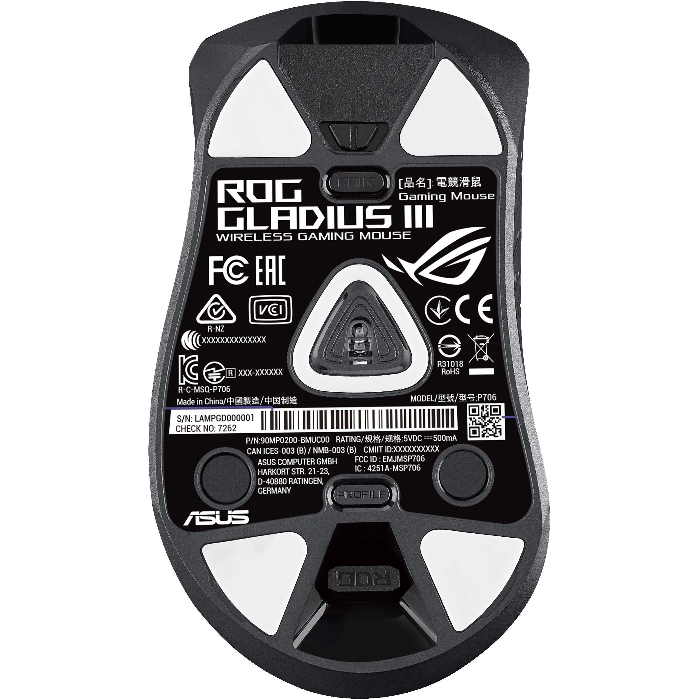 Black ASUS ROG Gladius III gaming mouse with RGB lighting and precise sensor for FPS gaming; wired USB connection.