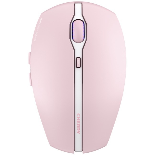 Ambidextrous gaming mouse in Kirschblüte pink finish; compact, lightweight Cherry build for comfortable long sessions.