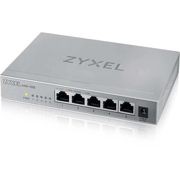 Compact 5-port Zyxel MG-105 Ethernet switch for small networks; simple, affordable, desk-friendly.