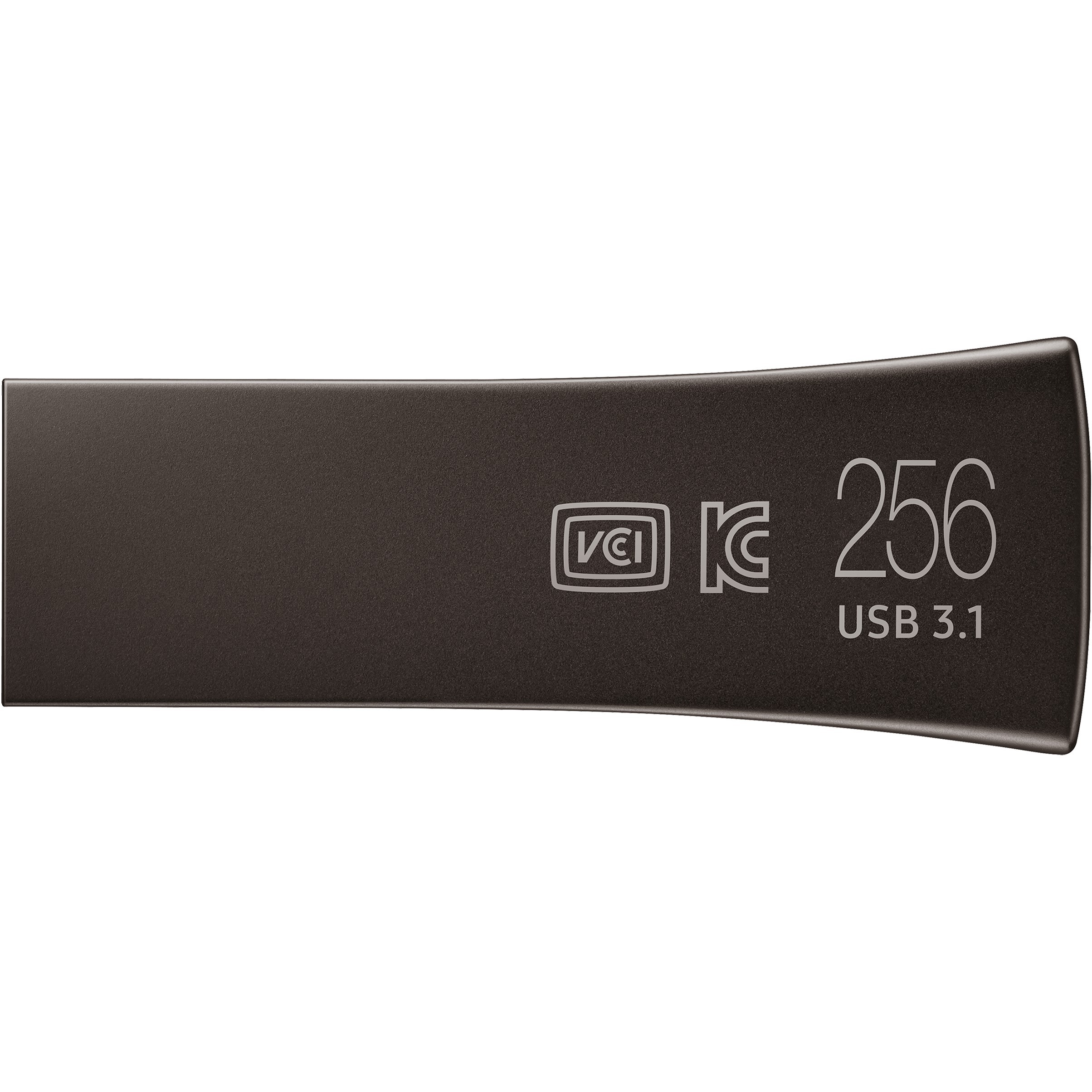 256GB Samsung Bar Plus USB 3.1 flash drive in Titan Gray; USB-A, USB 3.1 Gen1 (5Gbps), portable, bus-powered.