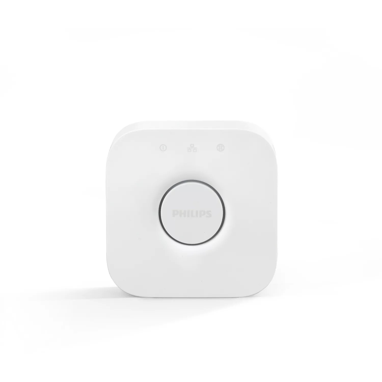 Ethernet-connected Zigbee bridge for Philips Hue lights; compact white hub enabling Hue control and automations.