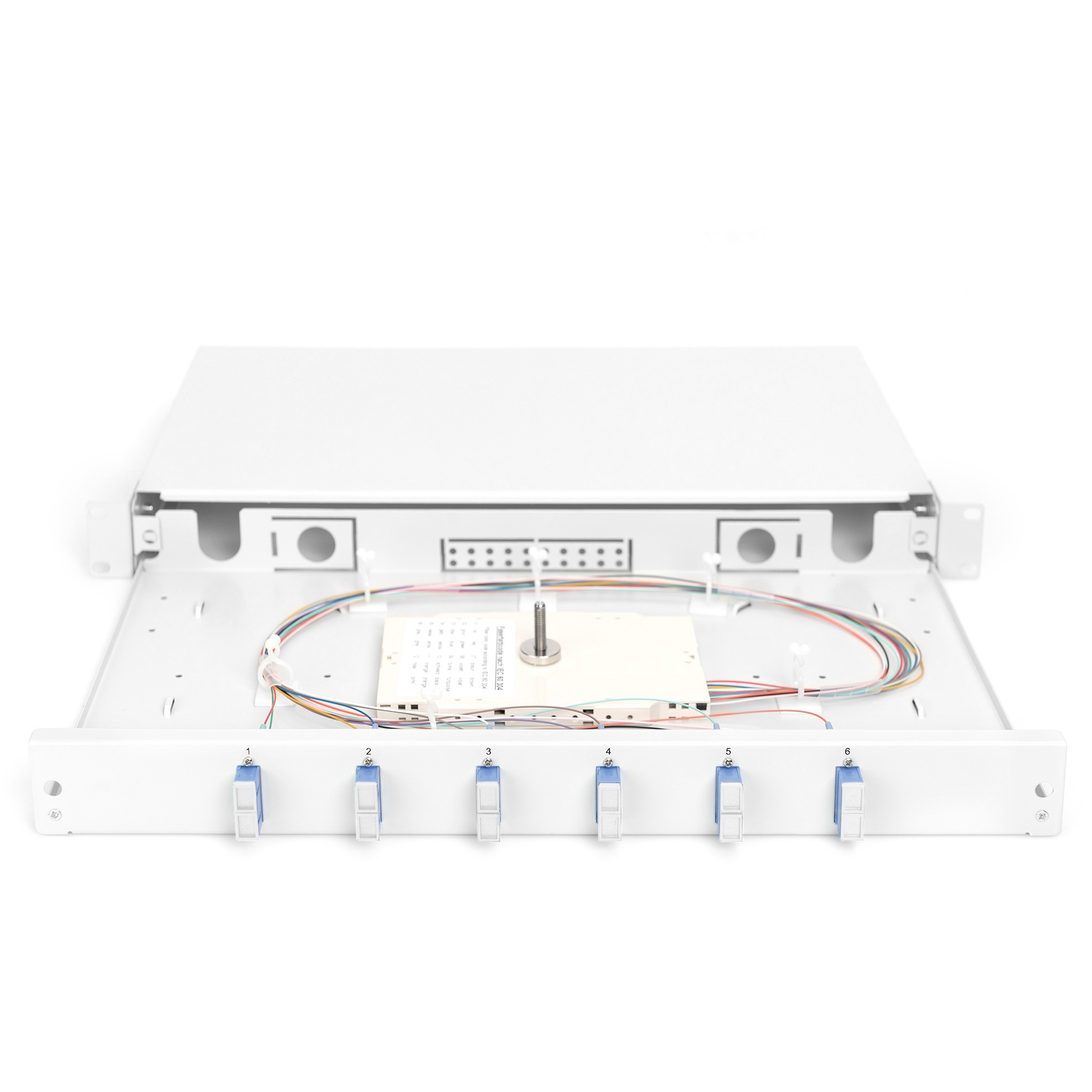 1U fibre splice box, pre-wired with 6x SC OS2, grey for 19-inch racks.