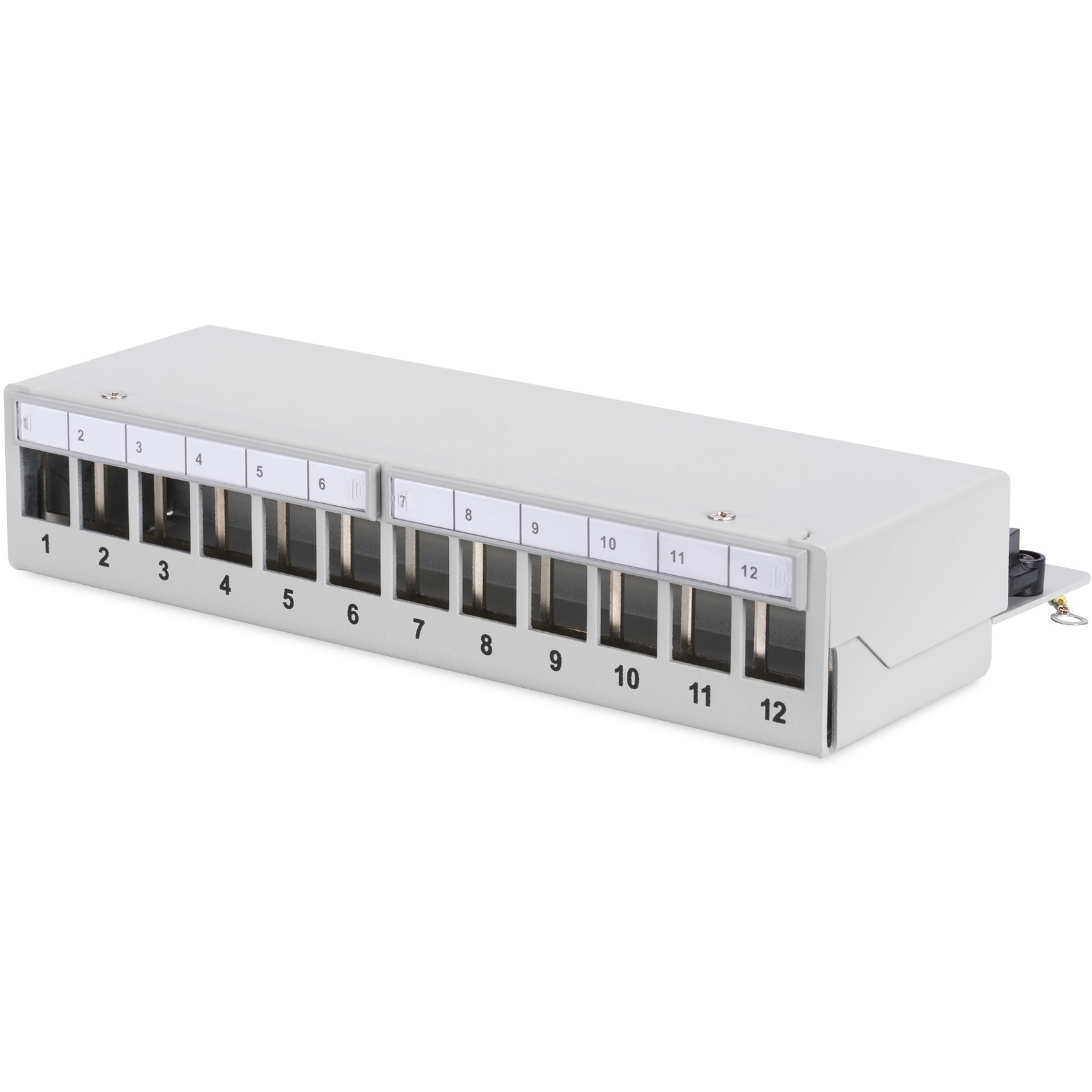 12-port modular patch panel in gray, 1U height, desktop/rack-mount capable for tidy network patching.