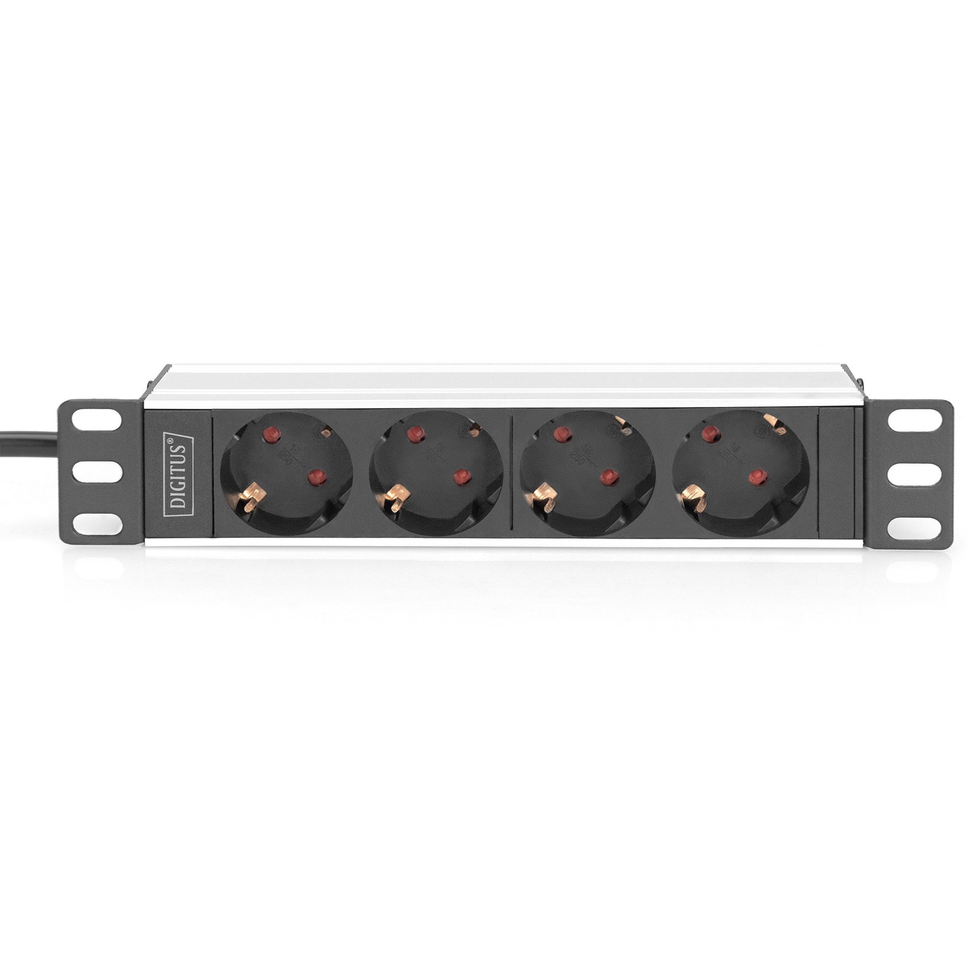 Digitus 10” Socket Strip with Aluminum Profile. 4-way safety sockets. PDU types: Basic. Rack capacity: 0U/1U. Housing material: Aluminium. Plastic. AC outlets quantity: 4 AC outlet(s). AC outlet types: Type F. Power plug: Type F. Cable length: 2 m. Nominal input voltage: 250 V. Maximum current: 16 A. AC input frequency: 50 - 60 Hz. Width: 45 mm. Depth: 254 mm. Height: 45 mm