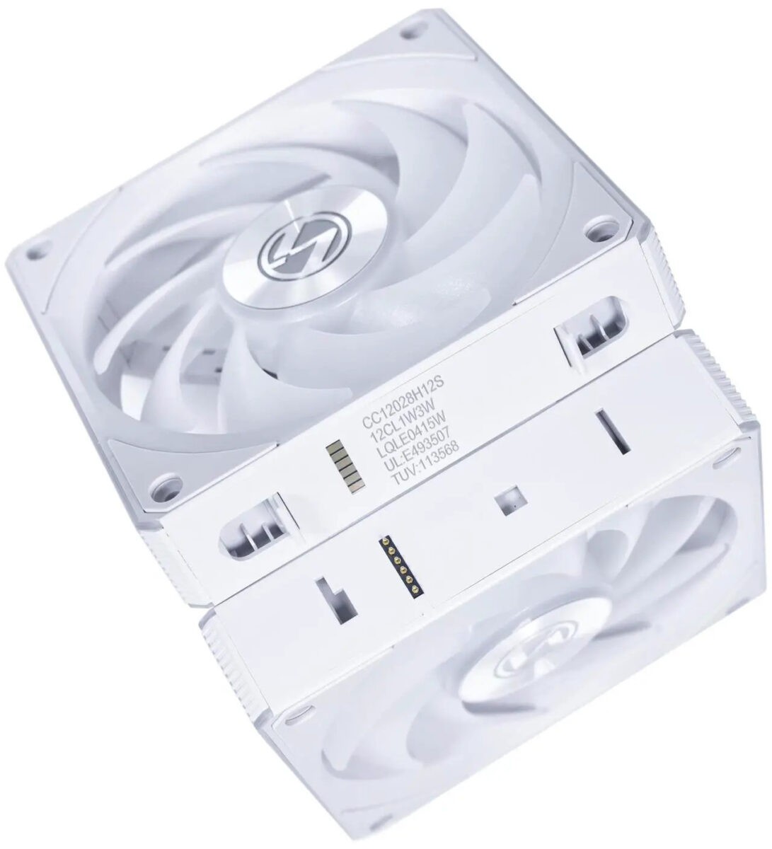 White Lian Li UNI RGB CL Wireless 120mm fan with ARGB lighting; no controller needed, easy install, static-pressure design for strong cooling.