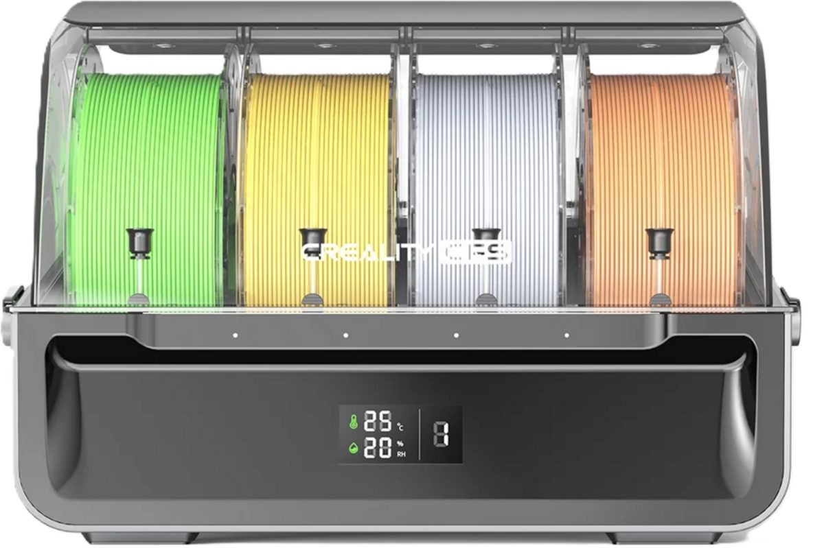 Smart CFS filament management with 4 spool slots for multi-color/multi-material printing; auto-load/unload, RFID recognition, and a drying/storage box.
