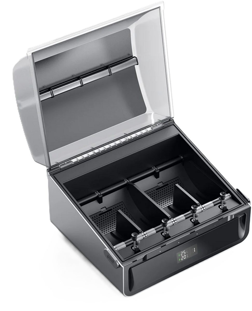 Το σύστημα φορτώνει και εκφορτώνει τα νήματα αυτόματα – δεν υπάρχει ανάγκη για χρονοβόρες χειροκίνητες αλλαγές νήματος. Επιπλέον, η καλά σφραγισμένη πολύχρωμη συσκευή με έξυπνες ενδείξεις θερμοκρασίας και υγρασίας μπορεί να χρησιμοποιηθεί ως κουτί στεγνώματος νημάτων για τη φύλαξη και αποθήκευση των νημάτων.
