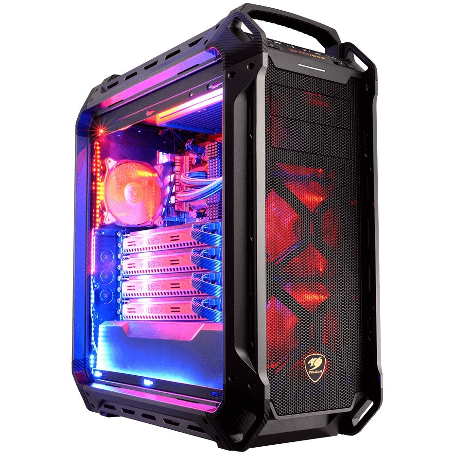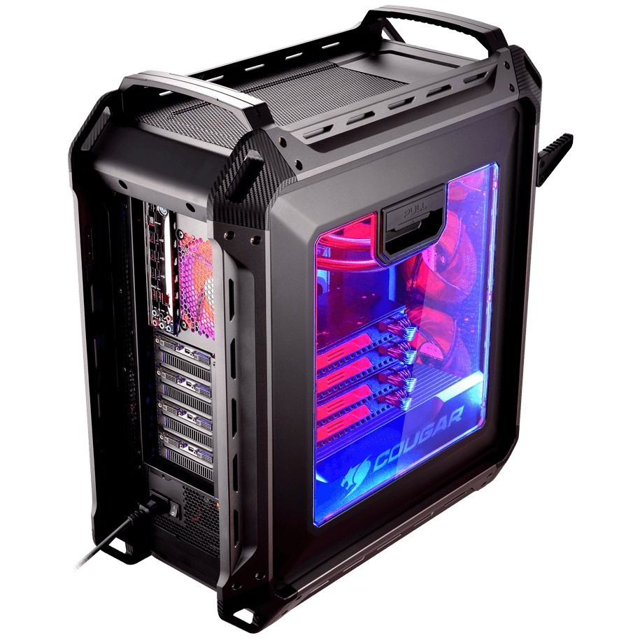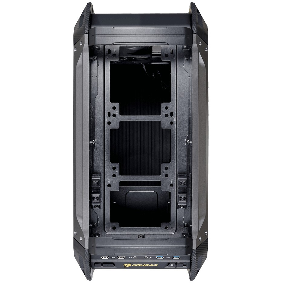 COUGAR Gaming Panzer Max. Form factor: Full Tower. Type: PC. Product colour: Black. Front fans installed: 2x 120 mm. Front fans diameters supported: 120.140 mm. Rear fans installed: 1x 120 mm. Supported HDD sizes: 2.5.3.5.5.25". Width: 266 mm. Depth: 612 mm. Height: 556 mm. Package width: 370 mm. Package depth: 658 mm. Package height: 658 mm