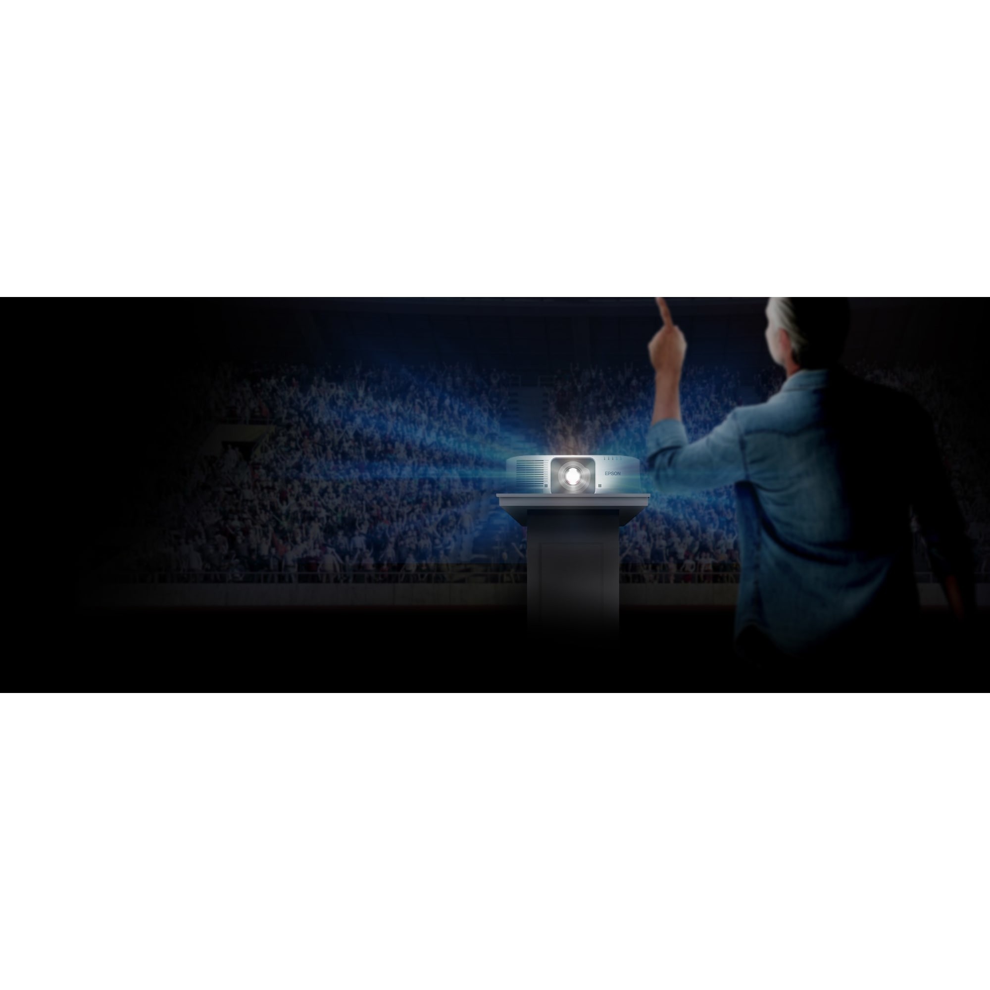 EPSON 3-LCD laser projector with 6000-lumen brightness, 16:10 aspect, VGA/DVI/HDMI, HDBaseT, USB, speaker, white.