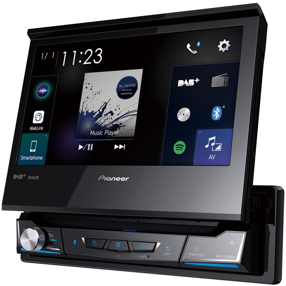 Pioneer AVH-Z7200DAB, Black, 1 DIN car stereo with CD/DVD playback, MOSFET audio, supports AAC, FLAC, MP3, WAV, WMA; JPEG image support.