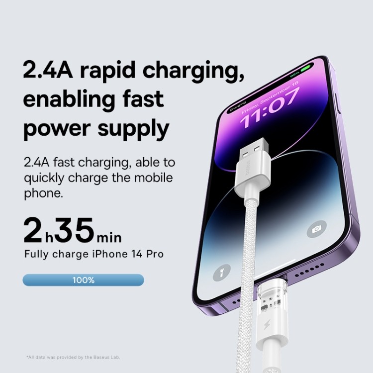 Baseus Gem Series Lightning to USB-A cable, 2m, Moon White, nylon braided with transparent design; 20W PD fast charging and intelligent recognition chip for stable charging.