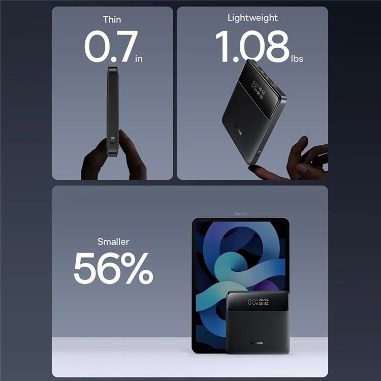 Baseus Powerbank 100W, 20000mAh with Display for fast charging; powers laptops and phones; slim, portable with 4-port output.