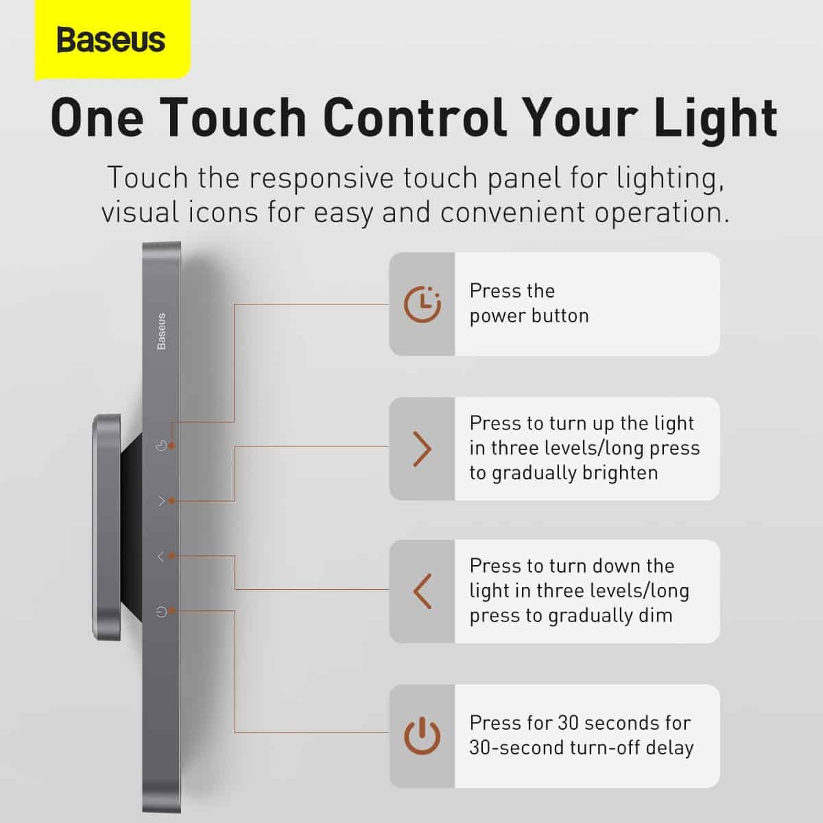 Baseus magnetic rechargeable LED lamp with portable design; three brightness levels; grey finish.