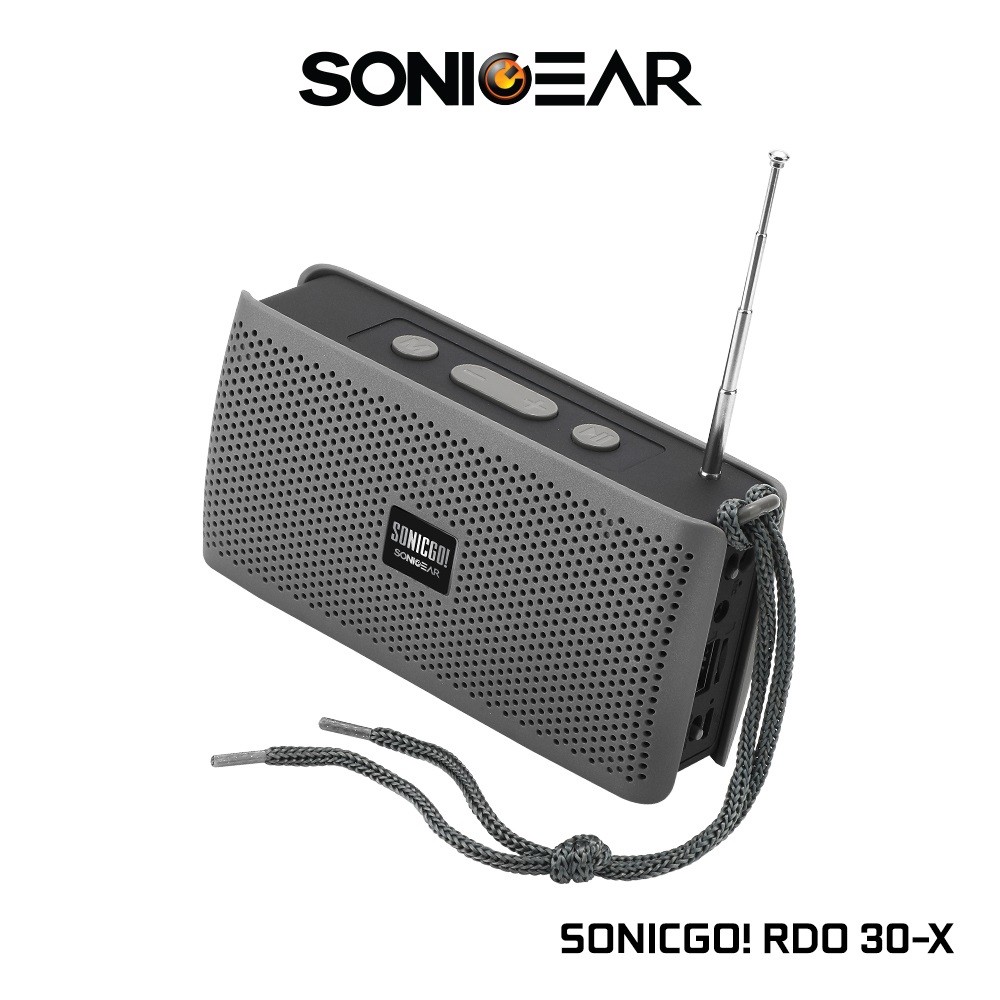 SonicGear SONICGO! RDO30-X portable Bluetooth speaker with Bluetooth 5.0, AUX-In, FM radio, and USB playback. 10W total (5W RMS), 4 Ohm, SNR > 90 dB, range up to 10 m.