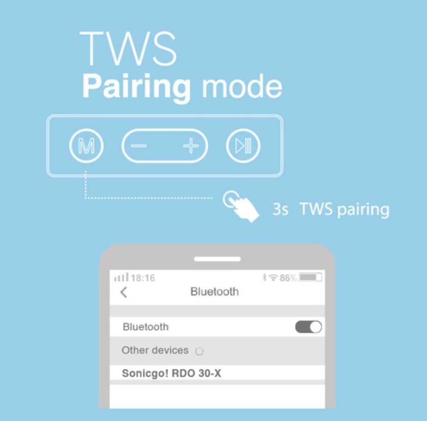 - Bluetooth Name : SonicGo! RDO-30xPlayback Duration @ 50% Volume Scale : Up to 5 Hour