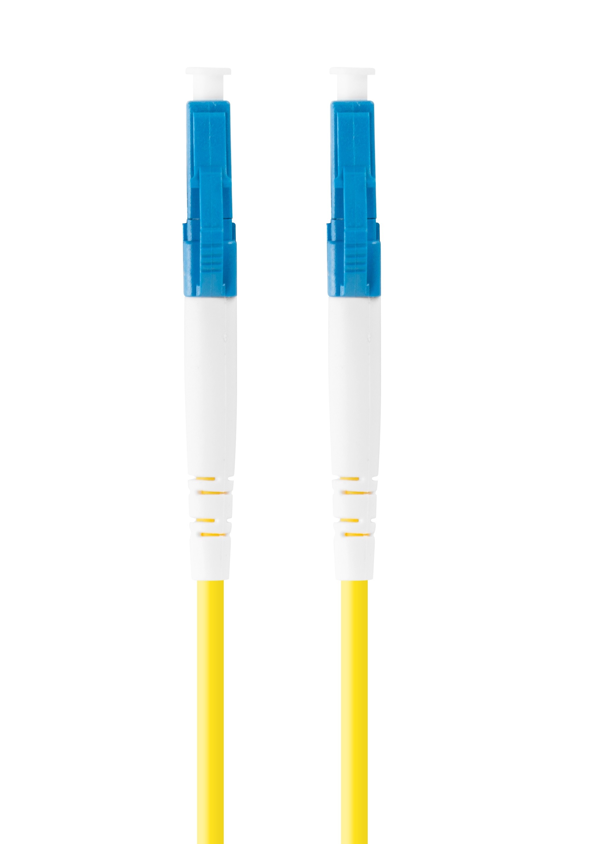 LC to LC single-mode patch cord with UPC polish, G657A1 fiber, LSZH coating, simplex, 1.0 m length, 3.0 mm Ø, yellow, IL <0.20 dB, RL >60 dB, -40 to 85°C, bend radius 10 mm.