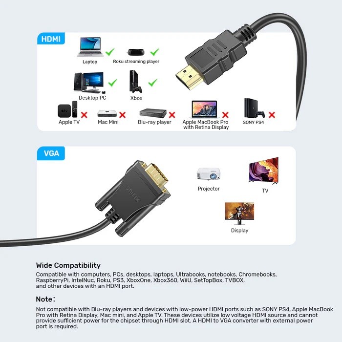 - Wide Compatibility: This HDMI-VGA cable is designed to be compatible with a wide range of devices including computers, PCs, desktops, laptops, Ultrabooks, notebooks, Chromebooks, Raspberry Pi, Intel Nuc, Roku, PS3, Xbox One, Xbox 360, Wii U, Set Top Box, TV BOX, and other devices with an HDMI port.