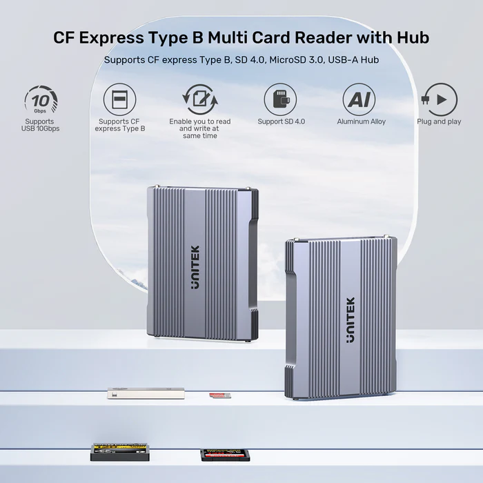 Ideal for photographers, videographers, designers and other professional users. UNITEK CF Express Type B Multi Card Reader supports a variety of latest memory cards including CF Express Type B, SD 4.0, and Micro SD 3.0 (TF).