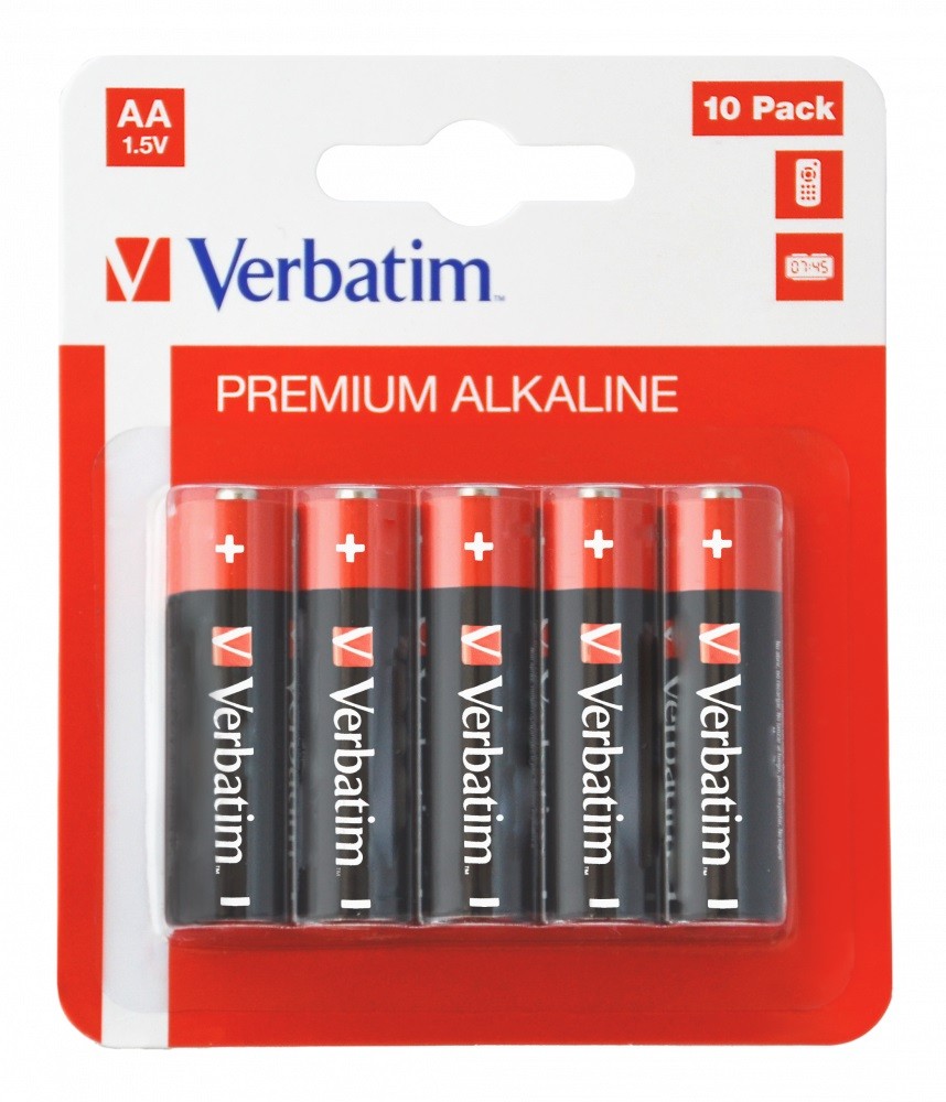 Verbatim AA alkaline batteries, 10-pack. Ideal for portable radios, MP3 players, cameras and remotes.