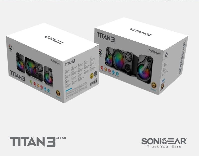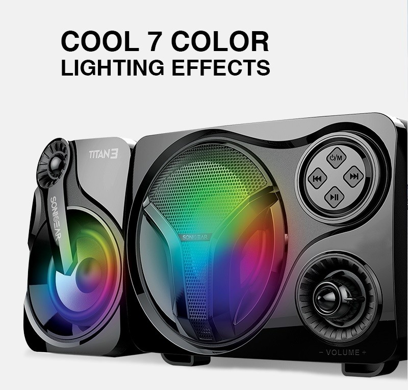 SonicGear Titan3 USB-powered 2.1 PC speakers with Bluetooth, AUX, TF Card, FM Radio, USB input, MP3 playback, true stereo, and 7-color lighting effects.