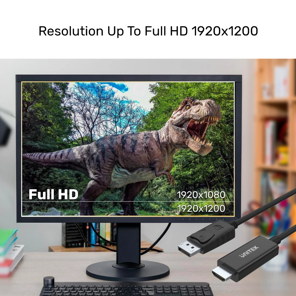 Unitek Y-5118CA DisplayPort to HDMI Cable supports PC up to 1920x1200 and HDTV up to 1080p; no software required; audio pass-through if source supports it.