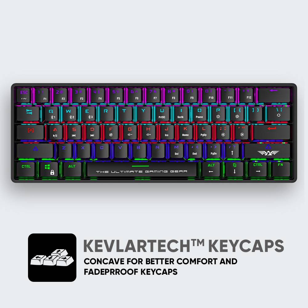 Dual-mode Bluetooth/Wired; pairs across 3 devices; 16.8M RGB backlight; Blue mechanical switches; 61-key layout.