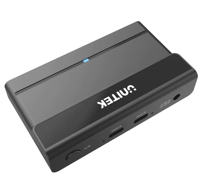 Unitek USB-C KVM switch enables 2 computers to share a 4-port USB hub with keyboards, mice, USB drives, printers, scanners, cameras, and more; switch between hosts easily.