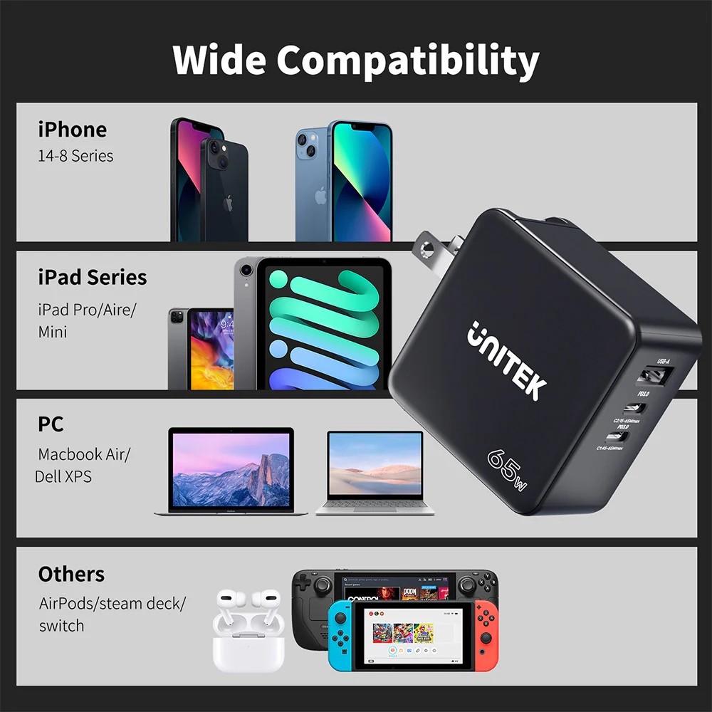 - Safety protection & customer support:Unitek 65W USB C PD charger complies with CE, FCC & UL certifications. Equipped with advanced circuit protection and multiple protection protect protocols such as: Short Circuit Protection, Over Temperature Protection, Overcurrent Protection, Overvoltage Protection, Overpower Protection.