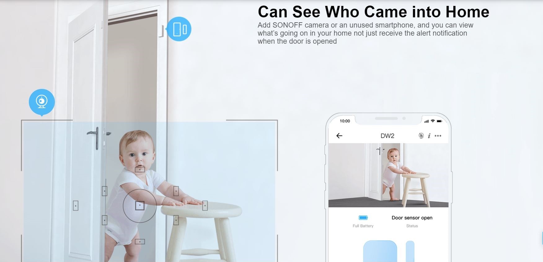Sonoff WiFi Door & Window Alarm Sensor; triggers scenes, notifies on open, shows status and battery; no gateway required; BLE pairing; history in app; easy peel-and-stick install.