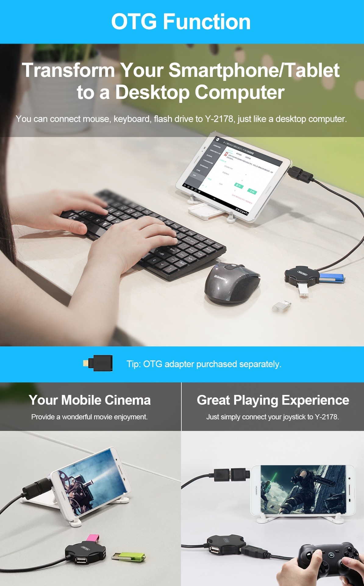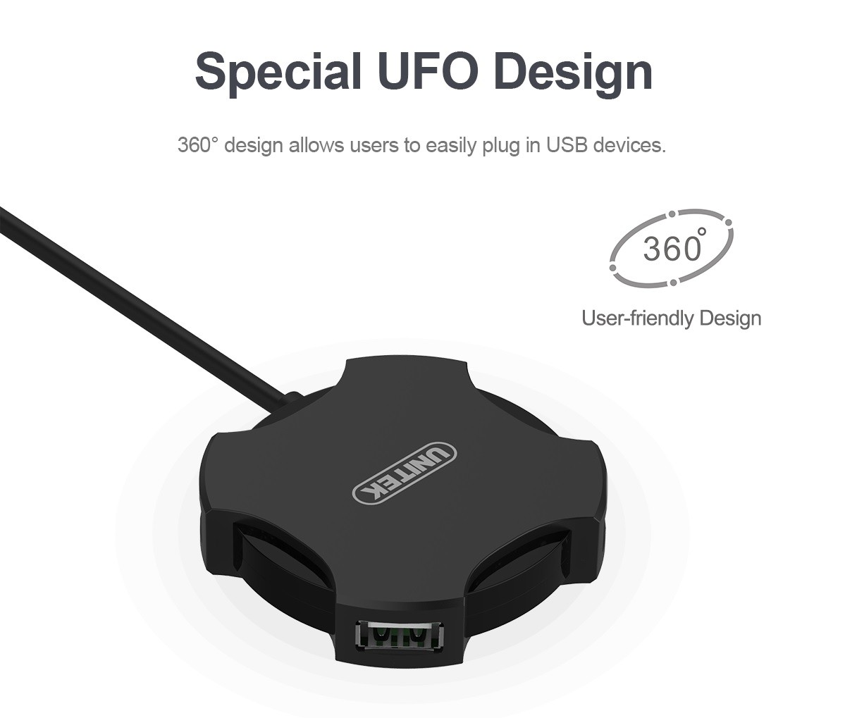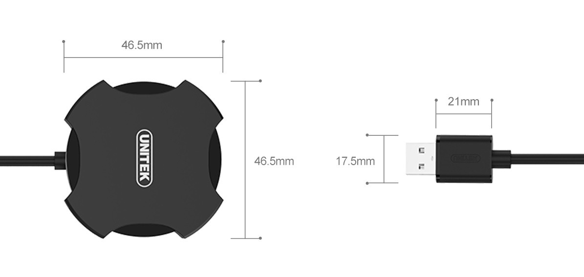 USB 2.0 4-port hub for expanding USB ports; USB 2.0 (480 Mbps) data transfer; backward compatible with USB1.1; plug-and-play, no driver required.